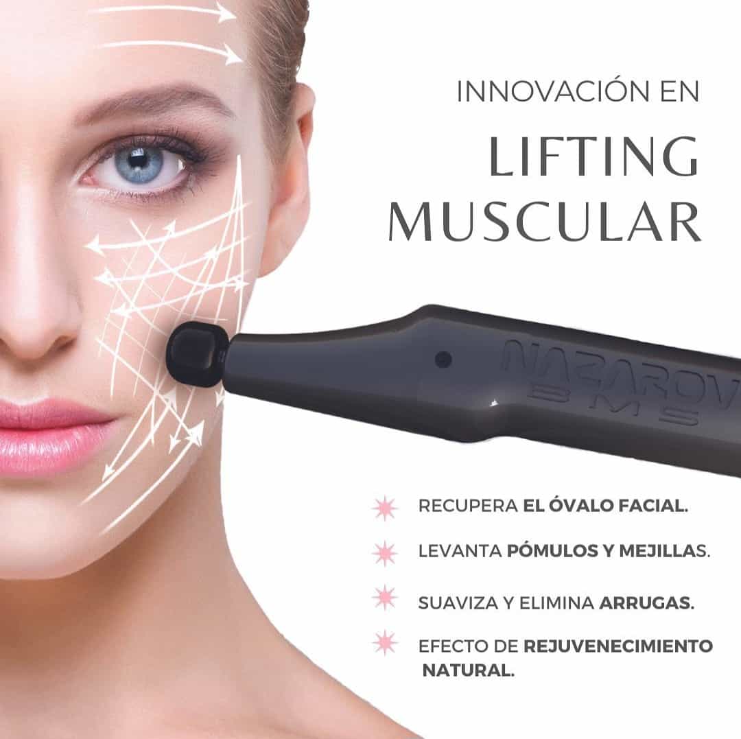 Una tecnología que devuelve el tono a los más de 40 músculos faciales. Patendado por el Dr. Vladimir Nazarov, jefe médico del equipo olímpico de la antigua URRSS